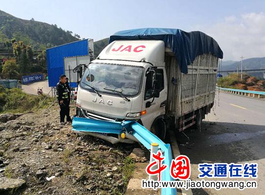 機動車經過路口要注意減速及留意周邊路況。3月29日,在貴州省凱里市爐山鎮,一輛滿載的大貨車在路口因避讓小貨車不及,撞上護欄,所幸事故未造成人員傷亡。