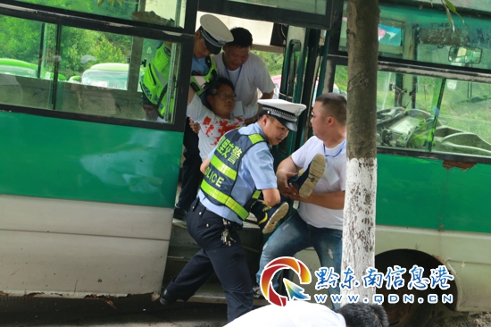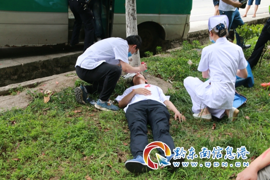 演練現場,一輛載客的小型中級汽車(19座)在發車后行車至箐口路段時由于天氣炎熱,氣溫較高,駕駛員疲勞駕駛導致車輛撞向右側邊坡,造成車上乘客1死3傷的一般道路交通事故。事故發生后,駕駛員第一時間撥打120急救,接著撥打“110”求援,隨后逐一檢查了乘客傷情。公司接到事故報案后,公司立即啟動緊急預案并報送相關部門。在接到事故救電話后,相關救援部門及時趕到,事故援緊張進行:120救護車到達現場實施急救處理,轉移重傷人員;凱里市交警大隊到達事故現場,維護現場秩序,設立警戒區域,展開事故現場勘察;應急車輛達到現場,組織乘客轉移。演練歷時兩個半小時結束。