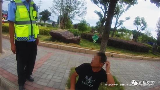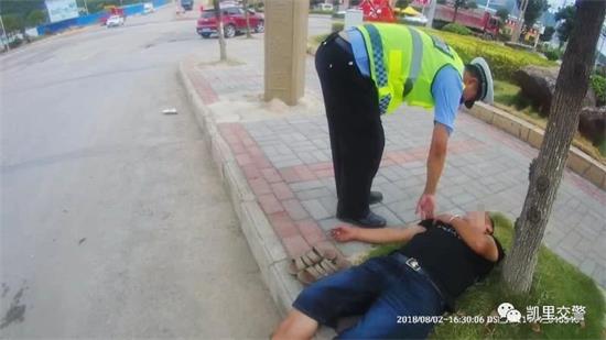 8月2日下午,凱里市公安局交警大隊爐山中隊在轄區日常巡邏,當巡邏至爐山鎮星光紅綠燈路口時,發現道路邊的行道樹下躺著一名男子。見此情況,爐山中隊巡邏交警立即停車上前查看該男子情況,發現男子有呼吸,且全身散發出一股濃烈的酒氣,初步判斷應該是喝多了,對交警的詢問毫無反應。