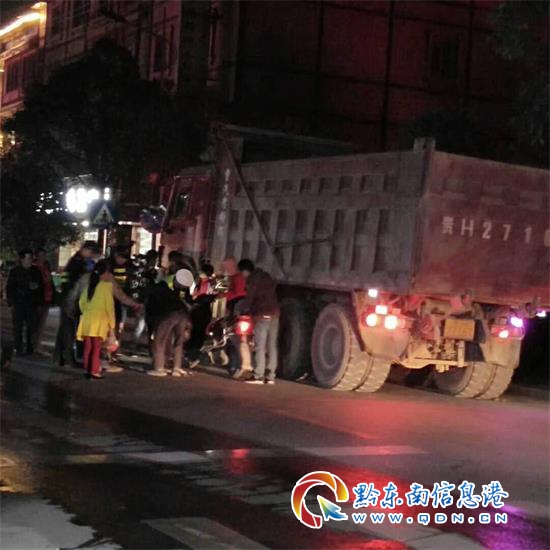 當晚八點半左右,一輛大貨車停在三棵樹集鎮的公路邊,之后駕駛員外出購物。期間,一輛摩托車(電動車)突然從他處駛來,緊接著載倒在了大貨車票后輪之間,駕駛員摔倒在地。