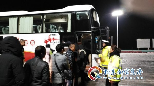 黎平縣公安局、高速交警與縣應急辦立即安排運政部門聯系兩輛客車,采取防滑措施,出發沿途接人。
