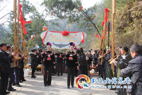 到了約定的時間,寨子里50多位“舅媽”身著盛裝到寨前公路兩旁迎接姑媽,余下的舅媽則在村道口擺下了12道霸氣十足的攔門酒。10多位舅爺吹起蘆笙迎接“姑媽”進(jìn)寨歡跳原生態(tài)蘆笙舞。