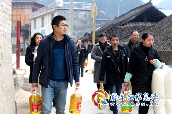 1月11日一大早,凱里中心副主任譚棟帶領一行慰問人員扛著一袋袋大米,提著一桶桶食用油及棉被趕往西江站受災職工唐鐘慧家里。唐鐘慧一家人看到慰問組的到來,帶著暖暖心情上前去迎接大家。