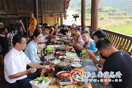 捉到魚后交給“嘎歌食府”主題餐廳烹制,一道道鮮香美味的酸湯魚美食會撲鼻而來,激起游客的美食味蕾。酸湯魚上桌,往往是一大鍋,燉在火苗上。粉紅色的湯面,淺白色的濃湯,小碟里是辣椒、蔥末、蒜泥等調味料,用鮮湯拌和,供醮食。先舀湯嘗一口,鮮美,酸而不烈,微辣,淡雅,特殊的香氣撲鼻而來。魚是本地的稻田魚。魚肉不嫩,而是緊韌,耐嚼,粘嘴,滋濃膏重。仔細吃魚,大口喝湯,你會開始相信,這才是真正的美味酸湯魚。湯的面上雖一片紅油,喝起來卻無油膩感,亦不辣,形成一種獨特的風味。