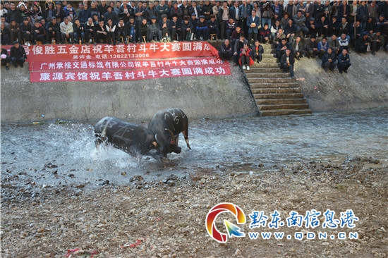 11月27日舉行D組牛爭奪賽,來自12頭斗牛牽入現場參與“打架”,雖然是六牙小牛,但比大牛對斗很是猛列,爭奪十分精彩。在爭霸賽到四輪決賽時,出現了來自凱里舟溪的7號牛、雷山黃里中寨的4號牛、凱里擺底的4號牛和雷山黃里中寨的11號牛表現突出,經過抽簽循環賽,最后爭奪冠軍時,來自舟溪村羅俊江的7號牛獲得冠軍,雷山黃里中寨李文的4號牛獲得亞軍,凱里小擺底潘年生的2號牛獲得季軍,而雷山黃里中寨李振江則獲得第四名。
