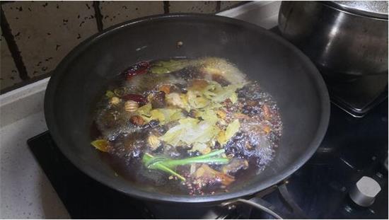 8、將白糖倒入60℃的油鍋中微火翻炒至翻紅起花。