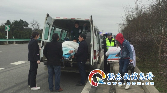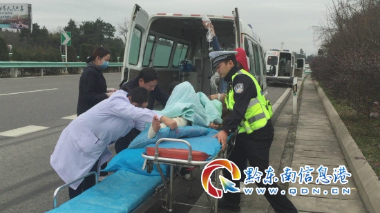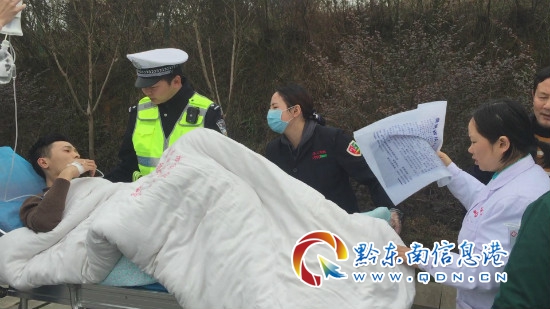 接警后,高速一大隊值班室迅速安排二中隊民警趕往現場進行救援。到達現場后,民警看見一輛從江縣人民醫院的救護車停靠在緊急停車帶內,車內躺著一名年輕男子及其家屬。病人家屬向民警介紹到,男子是因車禍導致左腿粉碎性骨折,但縣城醫療條件有限,無法對男子進行手術治療,便需要轉到貴陽醫學院第二附屬醫院(凱里市四一八醫院)進行進一步的治療。