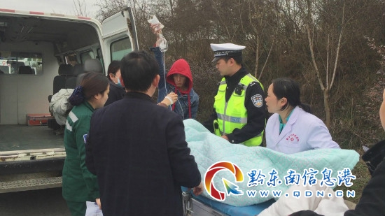沒過多久,貴陽醫學院第二附屬醫院(凱里市四一八醫院)的轉運車輛就到達了現場,在民警的協助下,將因車禍受傷的男子,轉移到轉運車輛上,并指揮救護車安全離開現場。