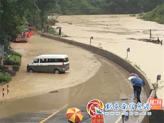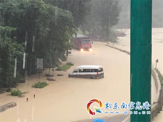 持續(xù)降雨導(dǎo)致凱里郭家坪某汽車檢測站旁側(cè)的低洼地漲水,導(dǎo)致經(jīng)過此處的黎爐公路數(shù)十米的路段被水淹沒,一輛經(jīng)過此處的面包車和大貨車被洪水圍困。目前,公路、交警部門正在全力排險,洪水水位有下降趨勢。