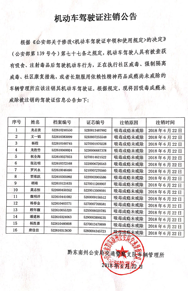 根據《公安部關于修改<機動車駕駛證申領和使用規定>的決定》(公安部第139號令)第七十七條之規定,機動車駕駛人具有被查獲有吸食、注射毒品后駕駛機動車行為,正在執行社區戒毒、強制隔離戒毒、社區康復措施,或者長期服用依賴性精神藥品成癮尚未戒除的車輛管理所應該注銷其機動車駕駛證。根據規定,現將因吸毒成癮未戒除被注銷的駕駛證信息公告如下: