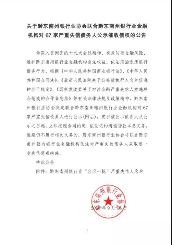 為深入貫徹黨的十九大會(huì)議精神,有效防范金融風(fēng)險(xiǎn),維護(hù)黔東南州銀行業(yè)金融機(jī)構(gòu)合法權(quán)益,依法懲治逃廢銀行債務(wù)行為,根據(jù)《中華人民共和國商業(yè)銀行法》,《中華人民共和國合同法》,《最高人民法院關(guān)于公布被執(zhí)行人名單信息的若干規(guī)定》,《國家發(fā)改委關(guān)于對(duì)涉金融嚴(yán)重失信人實(shí)施聯(lián)合懲戒的合作備忘錄》等有關(guān)法律法規(guī)及政策精神,黔東南州銀行業(yè)協(xié)會(huì)決定聯(lián)合黔東南州轄內(nèi)銀行業(yè)金融機(jī)構(gòu)對(duì)67家嚴(yán)重失信債務(wù)人進(jìn)行公示(附后),要求被公示債務(wù)人從公示之日起,立即按照合同約定,依法依約清償貸款本息義務(wù)。逾期仍不履行相關(guān)義務(wù)的,黔東南州銀行業(yè)協(xié)會(huì)將聯(lián)合黔東南州轄內(nèi)銀行業(yè)金融機(jī)構(gòu)依法對(duì)嚴(yán)重失信債務(wù)人采取進(jìn)一步失信懲戒措施。