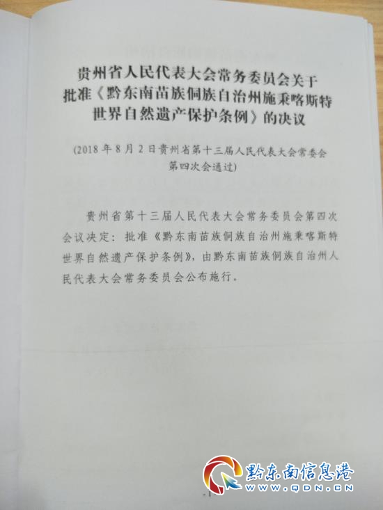 為了有效保護、管理和合理利用施秉喀斯特世界自然遺產資源,根據《中華人民共和國民族區域自治法》等有關法律法規的規定,結合自治州實際,制定本條例。會上,黔東南州人大內司委主任委員白朝貴介紹,本條例立法的意義在于四個“需要”。即世界自然遺產保護的需要;保護良好生態環境,促進可持續發展的需要;開展教學、科研的需要;保護旅游資源,發展旅游的需要。