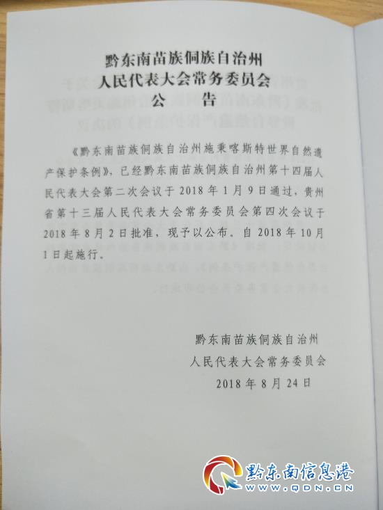 發布會上,黔東南州人大常委副主任吳明宣讀《貴州省人民代表大會常務委員會關于批準<黔東南苗族侗族自治州施秉客斯特世界自然遺產保護條例>的決議》和州人大常委會公告;州委常委、州人民政府副州長沈翔發表重要講話。