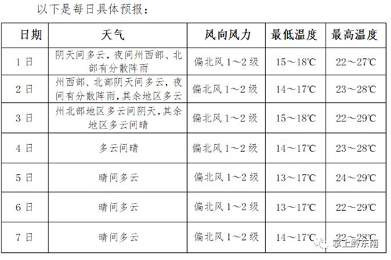 具體預報指出,10月1-3日期間,州西部、北部地區天氣狀況較差,以陰間多云為主,夜間部分鄉鎮會出現一些分散陣雨,但影響不大,10月4日-7日,全州各地都將持續以多云間晴的好天氣為主,白天午后最高氣溫可達26度左右,但早晚氣溫較低,最低氣溫在13-15度之間,晝夜溫差將達10度以上。