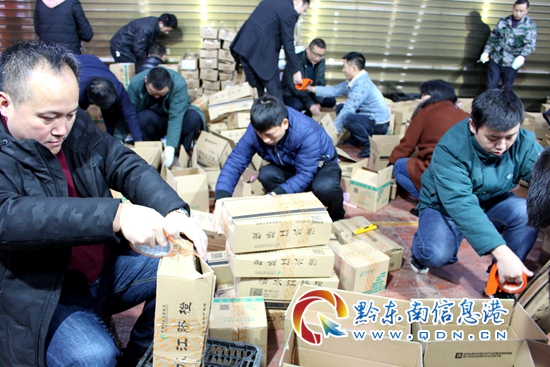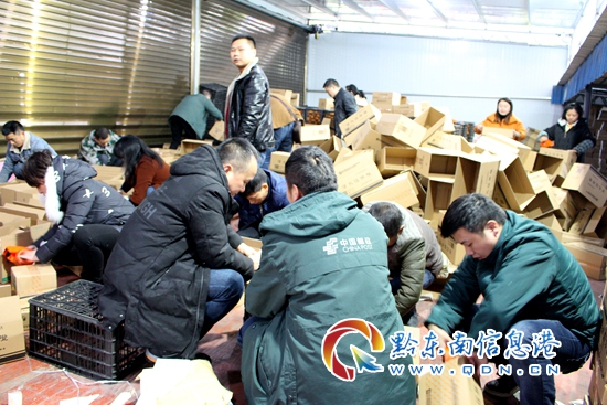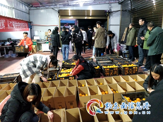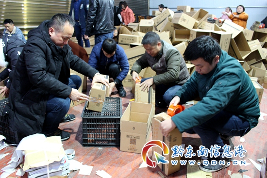 在黔東南州郵件處理中心處,記者看到郵件處理中心的工作人員正有條不紊地打包著椪柑,人數(shù)多達幾十人。經(jīng)記者了解后得知,眼前的這一幕是中國郵政集團公司對貴州從江縣的助農(nóng)脫貧項目。為加快椪柑運輸時限,12月8日(周末)一早,州郵政公司動員州公司各黨員及所有不當班干部職工迅速加入椪柑打包隊伍。
