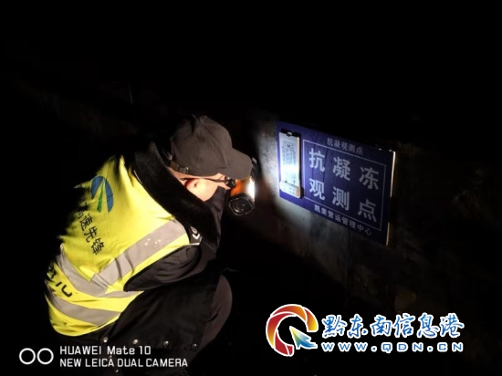 “榕江橋隧站正在開展抗凝保通夜間巡查, 高隨值守點抗凝觀測點氣溫4°C,k1200值守點抗凝觀測點氣溫2℃,毛雨,路面濕滑,未出現(xiàn)凝凍現(xiàn)象”。