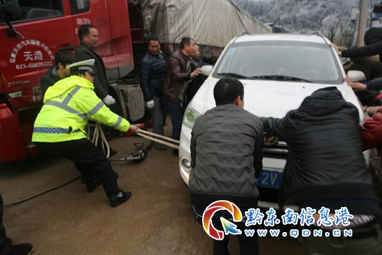 舒秀鋒當即將返鄉民工和滯留車輛情況,以及通往余慶縣的施張線公路凝凍情況詳實地向縣公安局、縣應急辦領導,以及縣人民政府領導作了匯報。這一情況當即引起了領導高度重視。隨即便決定采取撒鹽化冰,帶道壓速的措施疏通施張線,將滯留的客車和貨車護送出境。獲此指令,舒秀鋒又立即派出警力一路對施張線實施管控,并協調社會力量對滯留于施張線的故障車輛進行救援。接著又帶領民警和交通路政部門人員一道撒鹽除冰,排除路面險情。