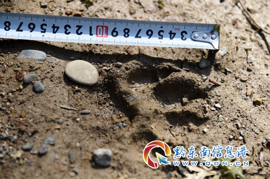 當(dāng)日,貴州省臺江縣森林公安局接到報警,在臺江縣萃文街道高寨村高寨電站“噶養(yǎng)八略”(地名)山林河邊,有村民發(fā)現(xiàn)一連串不明大型動物腳印。當(dāng)?shù)厣止簿至⒓辞巴F(xiàn)場開展走訪調(diào)查,并聯(lián)系貴州大學(xué)生物多樣性與自然保護(hù)研究中心專家組前往現(xiàn)場進(jìn)行勘察,在海拔1230米的深山老林河灘邊,共發(fā)現(xiàn)50多個同樣大小的動物腳印,腳印呈梅花狀,屬大型貓科動物所具有,直徑均在12厘米左右,前后掌的步幅約為1米。同時,調(diào)查人員還對部分較完整的足跡樣本和圖片資料,進(jìn)行現(xiàn)場采集,并將樣本送至貴州大學(xué)生物多樣性與自然保護(hù)研究中心進(jìn)行檢驗(yàn)。