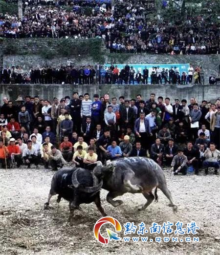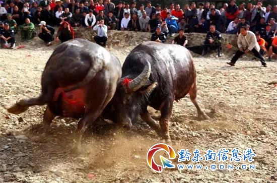 到了7月29這天,交下則會組織起苗家人最熱愛的民俗節目——斗牛,“斗牛”俗稱放牛打架。每次開始前,待對陣雙方牛主牽著斗牛繞場一周“踩場”過后,斗牛即由主持人宣布開始。剎時,人群歡聲雷動,嗩吶喧囂,鼓樂齊鳴。激戰中,難解難分者有之,打翻在地者有之,倉皇敗逃者有之。斗牛結束,人科紛紛給勝者披紅掛彩,并向其主人敬酒祝賀。