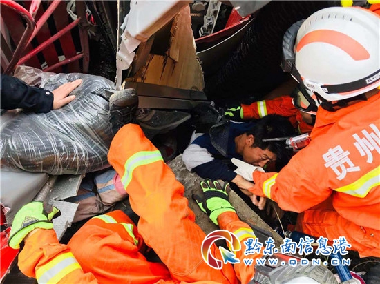 到達現場后,消防指戰員經現場偵察發現,事故車輛向右側翻在地,附近都是散落的鉛塊,車頭正好撞在山體一塊大石頭上,形成一道“夾縫”,1名人員被卡在“夾縫”內,意識清醒,但無法動彈,十分驚慌。據稱“當時車上共有兩名人員,1名駕駛員已被交警救出送往醫院救治。”