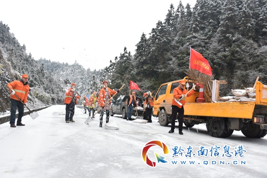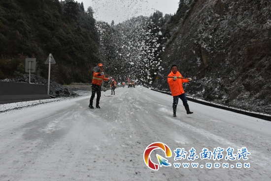 本網訊 2018年1月26日至28日,受低溫凝凍天氣的影響,天柱及錦屏境內公路結冰凝凍,行車受阻。貴州省天柱公路管理段防凍防滑應急隊員在國道G242(天柱縣城至湖南新晃境內)、省道S308(天柱縣邦洞至三穗界)和省道312線(錦屏星子界至八受)進行撒鹽除冰,確保公路安全暢通。(羅顯澄)