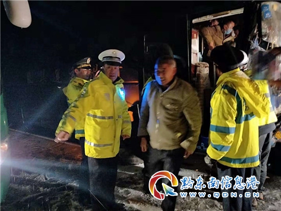 當(dāng)天晚19時(shí),黔東南州公安局交警支隊(duì)高速五大隊(duì)接到該起事故報(bào)警后,立即趕往現(xiàn)場,同時(shí)通知救援力量前往。當(dāng)民警來到現(xiàn)場時(shí),天空正吹著雨夾雪,路基已出現(xiàn)結(jié)冰現(xiàn)象,民警上前發(fā)現(xiàn),是一輛大型客車追尾一輛白色越野車發(fā)生事故,客車前端嚴(yán)重受損,乘客全部困在車內(nèi),情況十分緊急。見此情形,民警立即對該路段進(jìn)行臨時(shí)交通管制,第一時(shí)間將乘客轉(zhuǎn)移至路外,待轉(zhuǎn)運(yùn)車輛到達(dá)后,再將乘客全部安全轉(zhuǎn)運(yùn)出高速,用拖車將事故車輛拖下高速,道路恢復(fù)正常通行,第一時(shí)間保護(hù)了乘客生命財(cái)產(chǎn)安全。