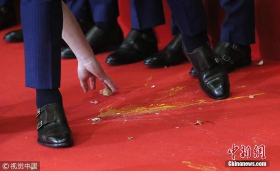當(dāng)?shù)貢r(shí)間6月29日,韓國(guó)首爾,2018俄羅斯世界杯,韓國(guó)男足回國(guó)接受采訪,被砸雞蛋、抱枕眾將側(cè)目。圖片來(lái)源:視覺(jué)中國(guó)