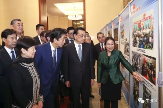 新華社的報道中,還專門提了一句:兩國總理同部分參與當年締約的雙方人士及家屬合影,并共同參觀中日經貿合作成果圖片展。