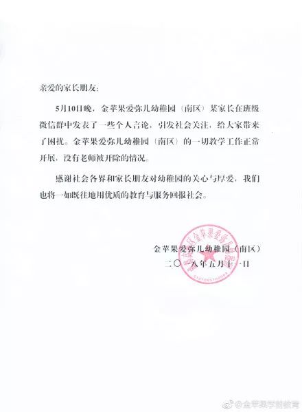 就在吃瓜群眾等著調(diào)查結(jié)果的時(shí)候,金蘋果幼兒園發(fā)了條不明所以的通報(bào)。