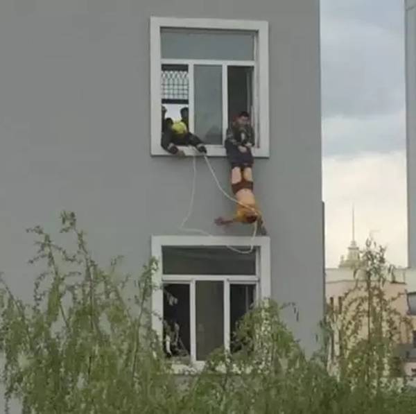 報警后,轄區消防人員和民警迅速趕到,在救援中這名男子竟然自己解開褲子,同時將救援人員拋來的繩索“扒拉”到一邊去。