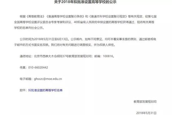 根據《高等教育法》《普通高等學校設置暫行條例》和《普通本科學校設置暫行規定》等有關規定,經第七屆全國高等學校設置評議委員會專家考察和評議,40所省級人民政府申報設置的高等學校獲得通過。