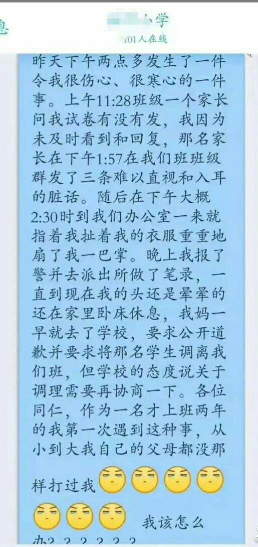 此事一發,教師們紛紛義憤填膺:一個外地來的小姑娘,平時也盡忠盡職,僅因為沒及時回復消息,就要受這種侮辱,太過分了!