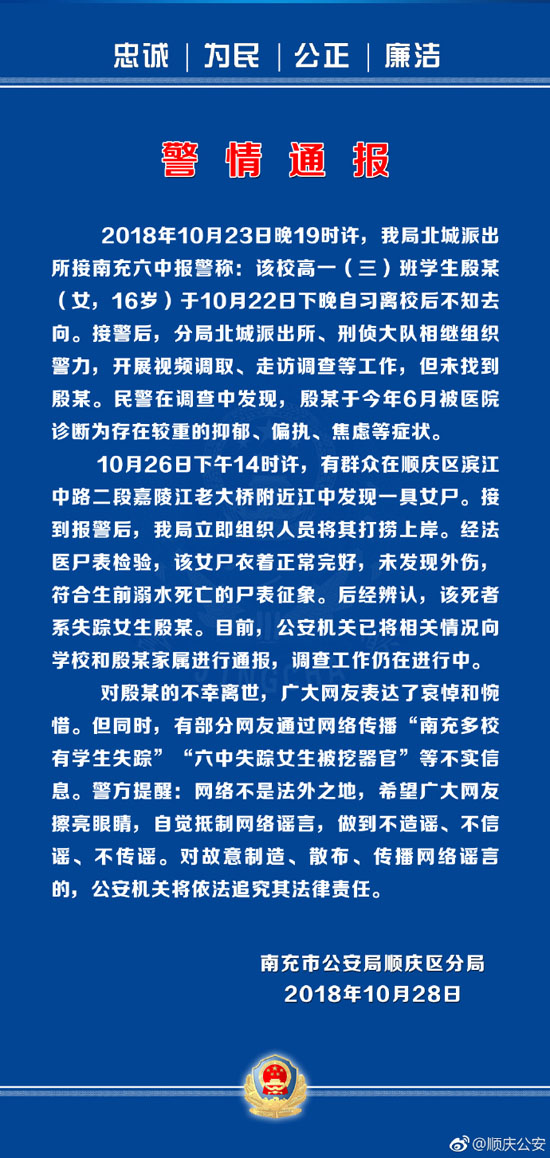 近日,一則“南充高中女生失蹤被挖器官”的新聞引起網(wǎng)絡(luò)輿論,四川南充市公安局顧慶區(qū)分局于28日發(fā)布警情通報稱,失蹤女生(殷某,16歲)尸體已找到,系溺水而亡,衣著正常完好,未發(fā)現(xiàn)外傷,生前被醫(yī)院診斷為較重抑郁癥,“失蹤被挖器官”為謠言。