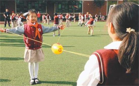 武漢市紅領巾學校學生在操場上分組玩“穿梭拉拉球”游戲