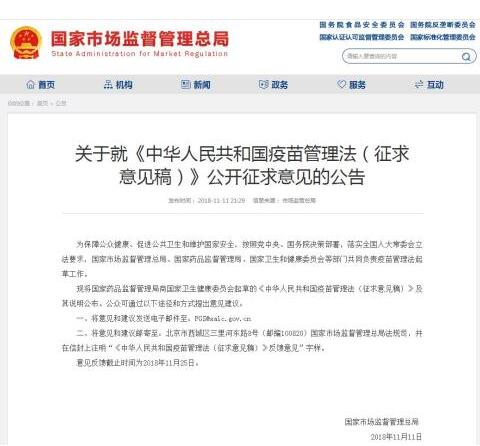 據國家市場監督管理總局網站消息:今日,國家市場監管總局關于就《中華人民共和國疫苗管理法(征求意見稿)》公開征求意見。公眾可通過兩種途徑和方式提出意見建議,意見反饋截止時間為2018年11月25日。