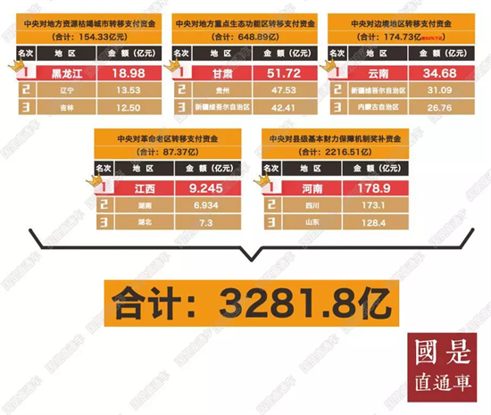 財爸本輪下發的紅包中,除了均衡性轉移支付資金,還有5類資金,分別是:中央對地方資源枯竭城市轉移支付資金、中央對地方重點生態功能區轉移支付資金、中央對邊境地區轉移支付資金、中央對革命老區轉移支付資金、中央對縣級基本財力保障機制獎補資金。