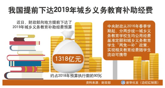 記者20日從財政部了解到,近日,財政部向地方提前下達了2019年城鄉義務教育補助經費預算1318億元,約占2018年預算執行數的90%。