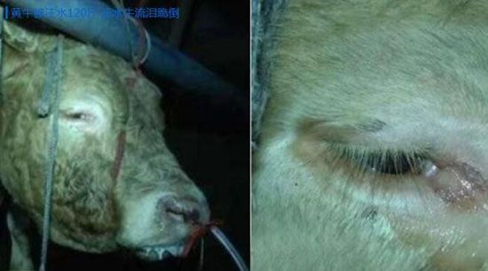 就在記者拍攝時,一頭被大量注水的牛承受不住而跪倒在地,眼中流出了痛苦的淚水。老板許某表示,牛反正是要宰殺的,有沒有注水等待他們的結果都是一樣。