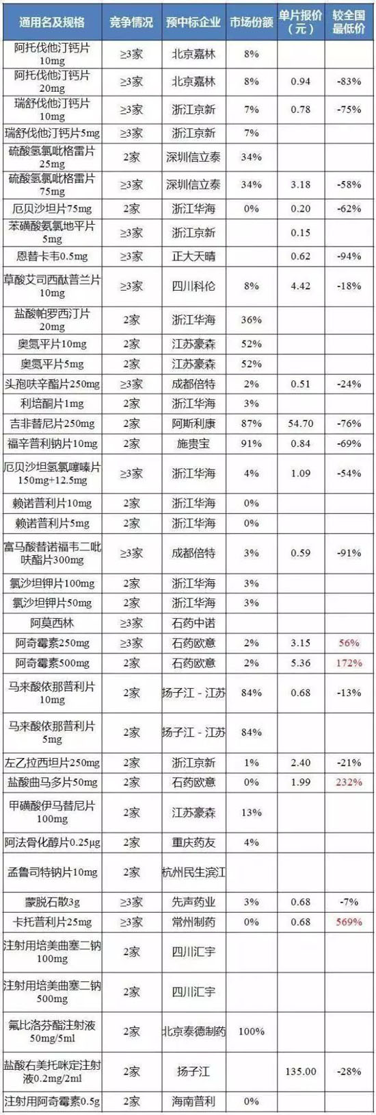 此外,阿托伐他汀鈣片、瑞舒伐他汀鈣片、利培酮片、吉非替尼片、厄貝沙坦氫氯噻嗪片、替諾福韋片等藥品降幅超過70%。