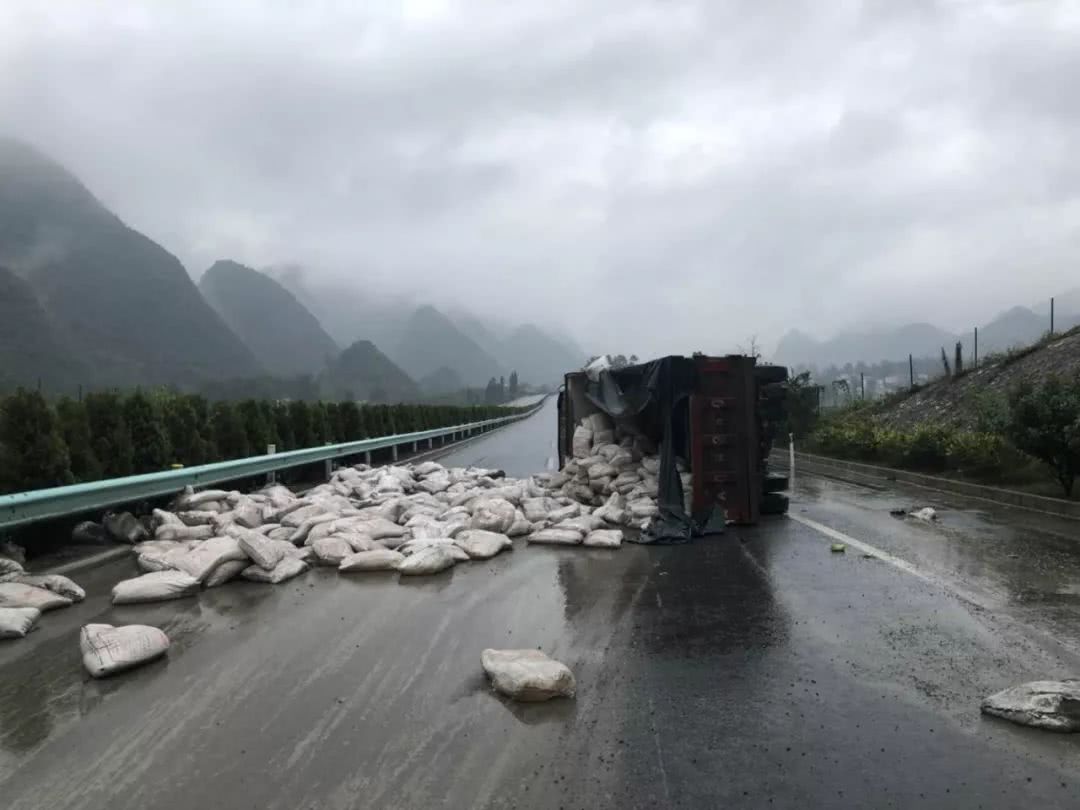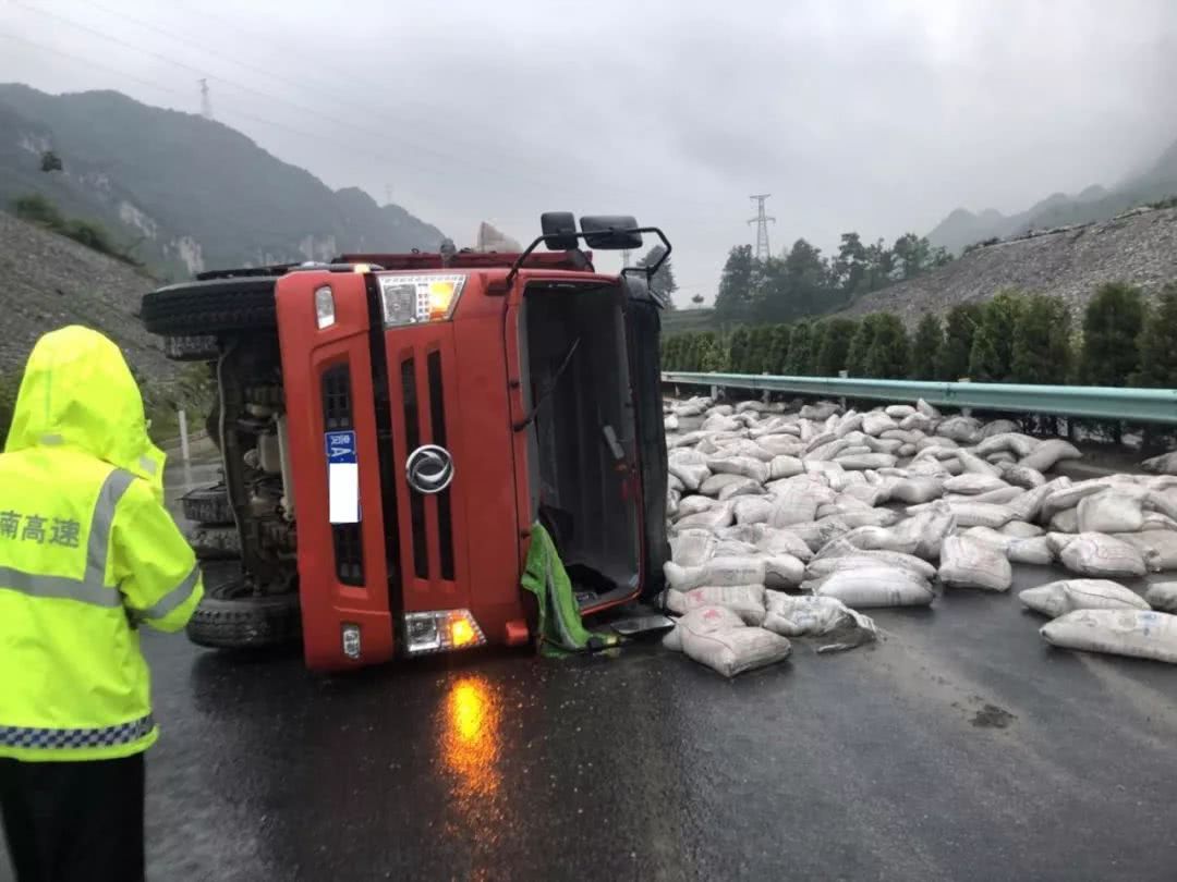 近日,黔南州公安局交警支隊(duì)高速四大隊(duì)民警接到報(bào)警稱在惠興高速惠水往長(zhǎng)順方向21公里處有一大貨車側(cè)翻,貨物散落一地,幸無(wú)人員受傷。