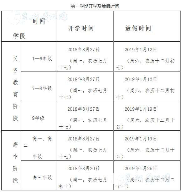 秋季學期,高三年級學生將于2018年8月20日開學,義務教育階段1-9年級、高一、高二年級學生將統一于2018年8月27日開學。1-8年級學生2019年1月12日即開始放寒假;9年級、高一、高二年級則推遲一周,2019年1月19日開始放假;高三年級學生2019年1月26日寒假開始。