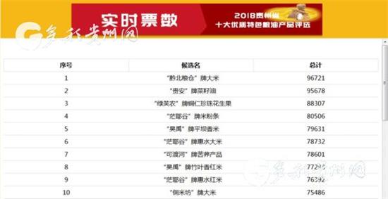 此次票數排名前十的參評產品,從第一位到第十位依次是:“黔北糧倉”牌大米、“貴安”牌菜籽油、“綠芙農”牌銅仁珍珠花生果、“茫耶谷”牌米粉條、“昊禹”牌平壩香米、“茫耶谷”牌惠水大米、“可渡河”牌苦蕎產品、“昊禹”牌竹葉香紅米、“茫耶谷”牌惠水紅米、“侗米坊”牌大米。來自貴州黔北糧倉米業有限公司的“黔北糧倉”牌大米以96721票位居榜首。“貴安”牌菜籽油、和“綠芙農”牌銅仁珍珠花生果分別以95678票、88307票位列第二、第三名。