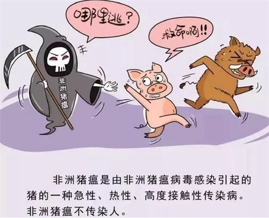 由非洲豬瘟病毒引起的一種急性、烈性、高度接觸性傳染病,發病死亡率高,可達100%,嚴重危害養豬業。非洲豬瘟不是人畜共患病,不傳染人。