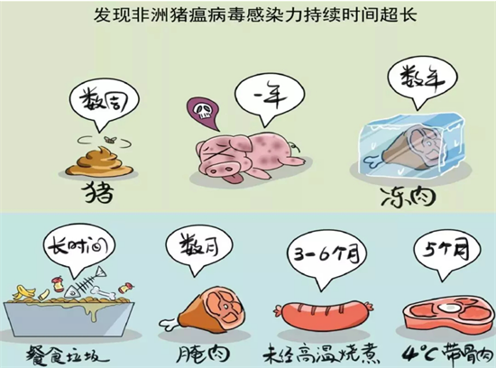 非洲豬瘟的潛伏期為5~19天,嚴重病例一般在感染后2~10天死亡,該病毒感染力超長,沒有疫苗可以預防,也沒有藥物可以治療。