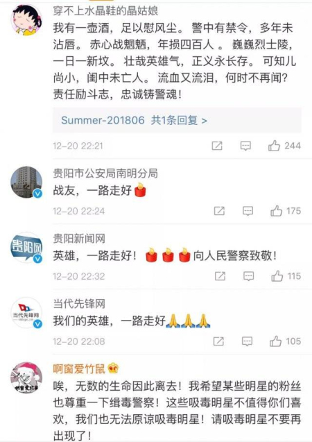 網友 @一舊言 :他們是行走在刀尖上的人,危險時刻相伴,死亡如影隨形,每一次出動都不知道有沒有命回來;他們為了家人安全,必須小心翼翼隱藏身份,在外見了面不能打聲招呼,甚至死去也不能立碑,不能讓家人去祭拜;他們毫無怨言地為這份工作拋灑熱血,甚至獻出生命 —— 謹以此作,獻給所有行于黑暗,追逐光明的緝毒警察!