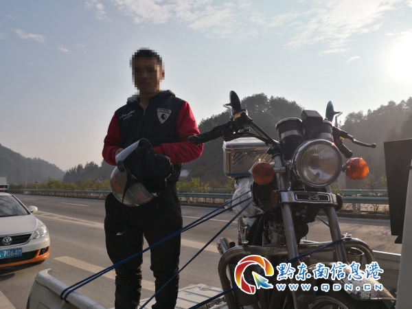 當天16時16分,男子駕駛兩輪摩托車,行駛至思劍高速金堡收費站路段時,被出警民警吳明、何長林成功攔截。經詢問得知,該男性駕駛員姓楊,鎮遠縣江古鎮人士,今年31歲,在安順富士康上班,臨近年關想買個摩托車回家過年,摩托車剛買來30天,正想騎車回家辦理牌照手續,在明知自己沒有摩托車駕駛證的情況下,擅自將未上牌的摩托車騎上高速,從安順到鎮遠足足騎行了360余公里。因過于疲倦,又不熟悉路況才在報京服務區休息,沒想到快到家了被民警攔截。隨后民警將楊某新購入的摩托車抬至警用皮卡車后備箱,運回駐地辦理暫扣手續,至此,瘋狂的無證駕駛飆車案告一段落。