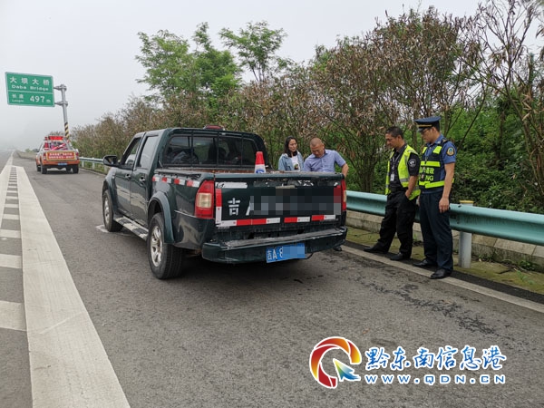 丹寨路政員查看爆胎車輛情況(潘壽清 攝)