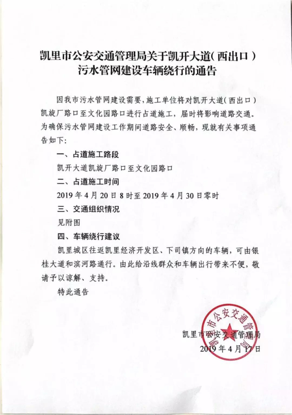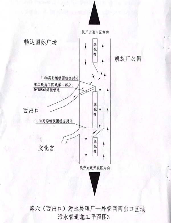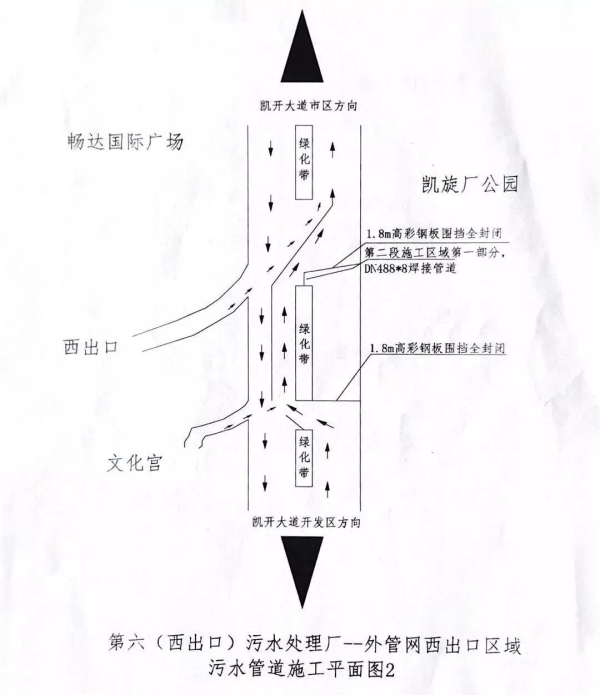 因我市污水管網(wǎng)建設(shè)需要,施工單位將對(duì)凱開大道(西出口)凱旋廠路口至文化園路口進(jìn)行占道施工,屆時(shí)將影響道路交通。為確保污水管網(wǎng)建設(shè)工作期間道路安全、順暢,現(xiàn)就有關(guān)事項(xiàng)通告如下: