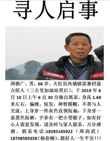 本網訊 (記者 王莉) 家住天柱縣鳳城街道68歲的周德廣老人從6月10日早晨6點30分左右獨自離家至今未歸,今天已經是4天了,尋人的線索斷斷續續,他的家人至今仍未找到他,皆心急如焚。今天上午,周德廣老人的兒子周先生向黔東南信息港緊急求助,希望通過網絡的力量,助他早日找到走失的父親。