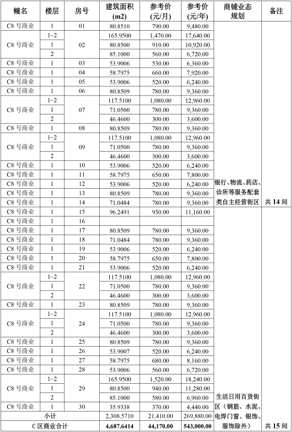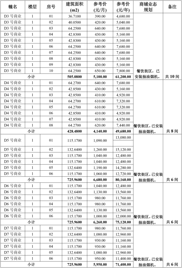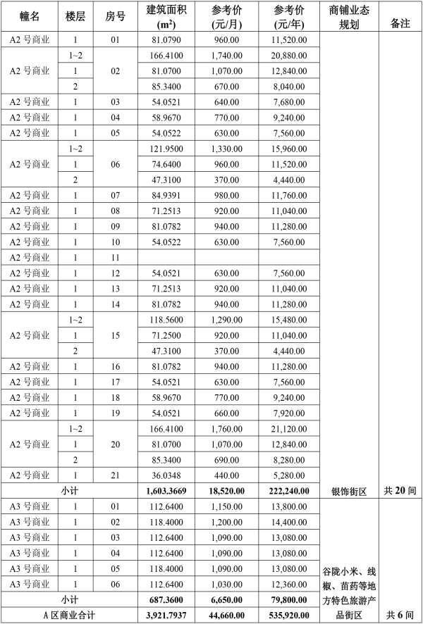 詳見附后的《商鋪拍租參考價(jià)及業(yè)態(tài)規(guī)劃基本情況表》。